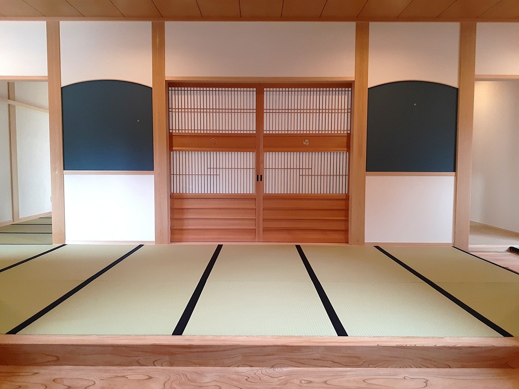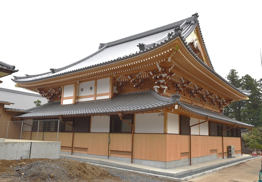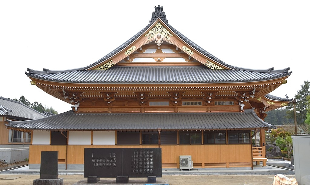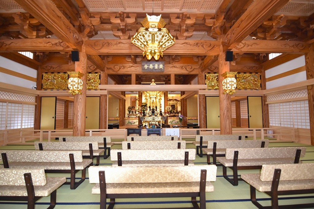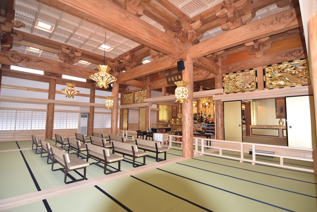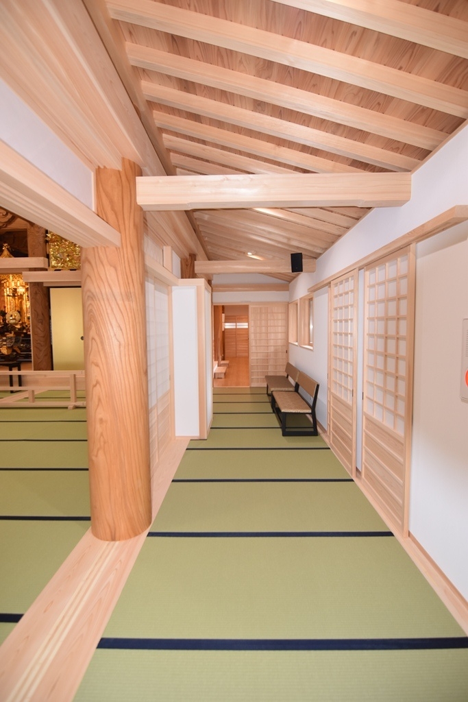 仕様 | ≪本堂≫ 木造,準耐火仕様(自主的), 流向拝付入母屋造,三州製本瓦葺, 二軒繁垂木 1枝6.6寸 柱頭装置:二手先斗栱、支輪 側柱:1.57尺~1.44尺丸(欅)、1.26尺~1.23尺丸(欅) 内部柱:1.47尺~1.44尺丸(欅)、1.26尺~1.24尺丸(欅) 庇柱:5.2寸角(檜) 長押:外部・内部共 成8.0寸 天井:内陣 折上小組格天井(2.3尺角) 他 小組格天井(2.1尺角) ≪会館≫ 木造平屋建, 準耐火仕様(自主的), 唐破風玄関付切妻造, 三州製桟瓦葺 和室3間(12.5畳・10畳・10畳)、応接室、寺務室、台所など 柱頭装置:舟肘木 主要柱:6.0寸角(檜)、5.0寸角(檜) 天井:和室 格天井(1.5尺角) 唐破風玄関 間口 2.5間 柱頭装置:平三ツ斗組 柱:8.0寸角(檜) 天井:格天井(1.5尺角) |