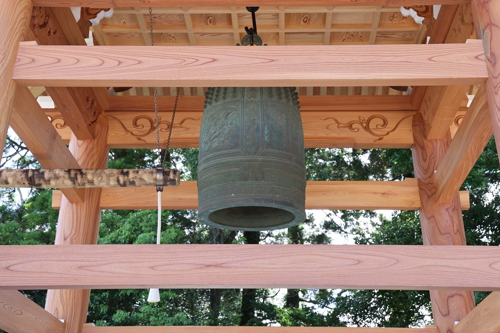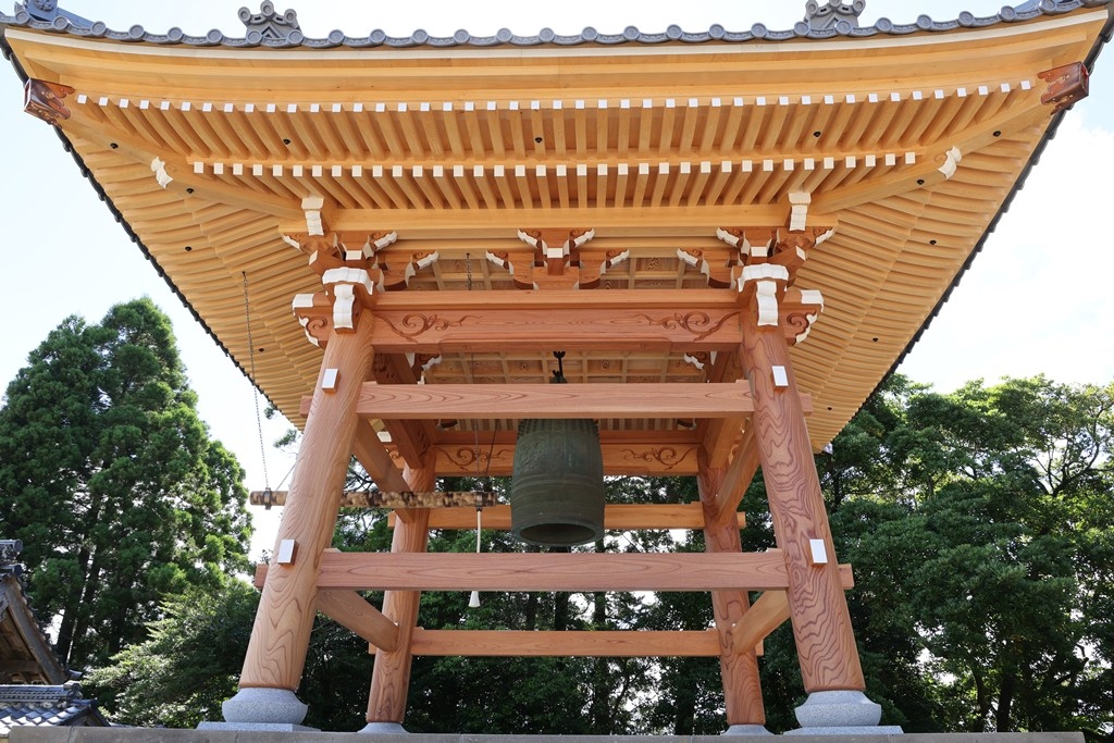 仕様 | ≪鐘楼≫ 木造,入母屋造,妻本掛け、三州製日本瓦桟瓦葺 二軒繁垂木1枝4.8寸(檜) 柱頭装置:出三ツ斗組(欅) 柱:1.25尺丸(欅) 頭貫、貫(欅) 桁、丸桁(檜) 天井:格天井 基壇:既存再利用 梵鐘:既設再利用 |