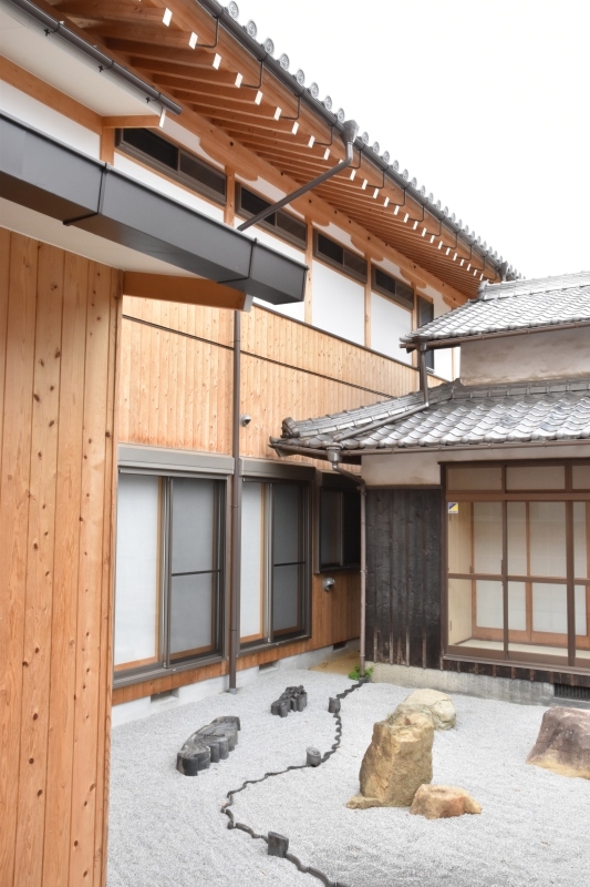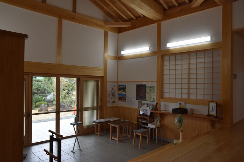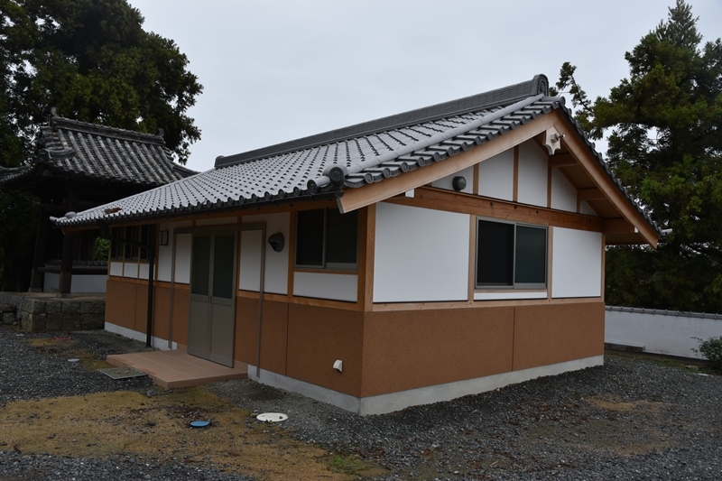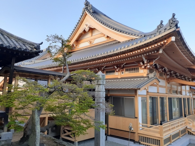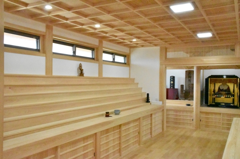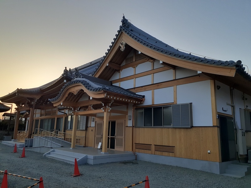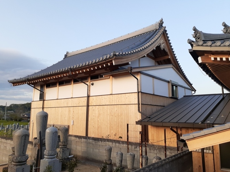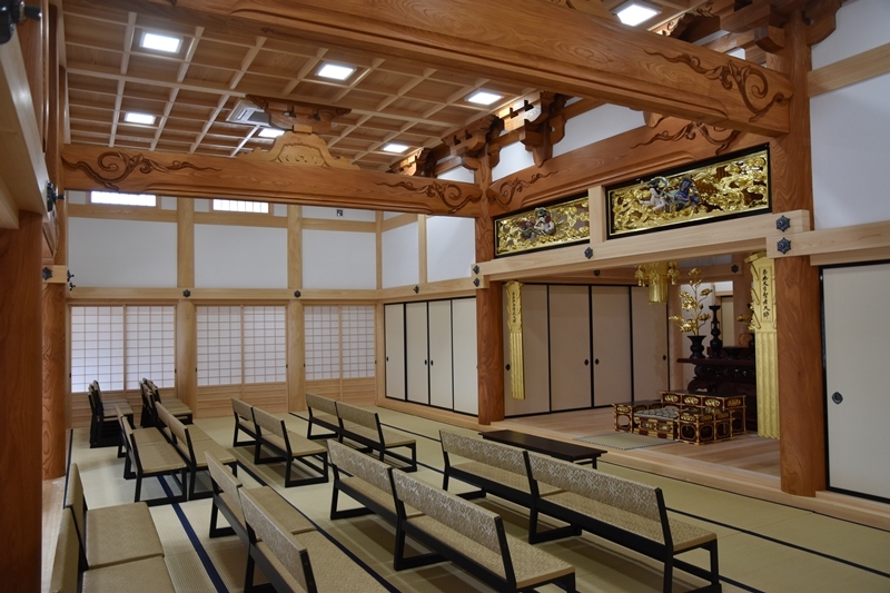 | 仕様 | ≪客殿≫ 入母屋造,流れ向拝付,三州製一体瓦葺,二軒繁垂木,一枝5.7寸 柱頭装置:和様出組 側柱:1.26尺丸(欅),1.1尺丸(檜) 内部柱:1.26尺丸,1.36尺丸(欅),1.1尺丸(檜) 向拝柱:1.06尺角(欅) 天井:内陣 折上小組格天井,上之間,書院 竿縁稲子天井 外陣:格天井2.2尺角 広縁:目透天井(天井材無垢) ≪庫裡≫ 切妻造:桟瓦葺 妻:本掛け 側柱:5.0寸角(檜) ≪位牌堂≫ 切妻造:三州製一体瓦葺 妻:本掛け 柱頭装置:舟肘木 通し柱:6.0寸角(檜) ≪外部便所≫ 切妻造:桟瓦葺 妻:並掛け 側柱:4.0寸角(檜) |