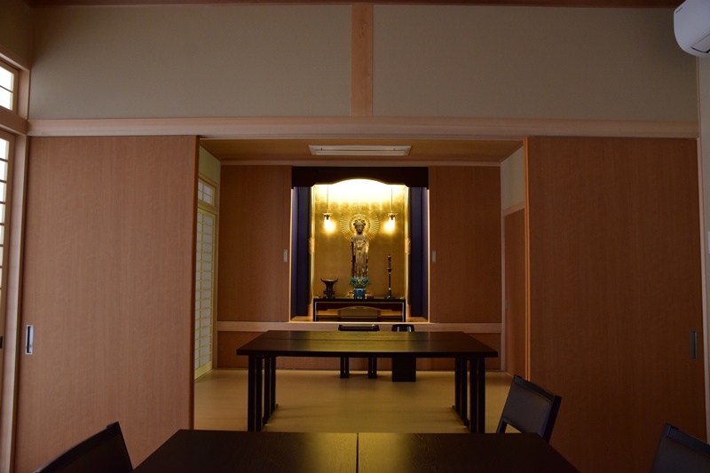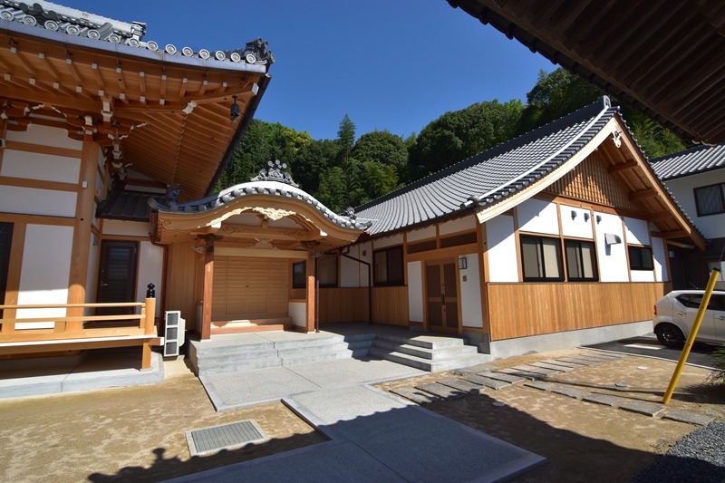 | 建物・大きさ | ≪本堂≫ 木造平屋建,入母屋造,流れ向拝付き、三州製一体瓦葺き 間口6.0間×奥行6.5間(身舎) 物入8坪,花立場2坪,後堂,廊下11坪(下屋) ≪庫裡≫ 木造平屋建,切妻造:三州製桟瓦葺 間口5.0間×奥行12.5間 ≪離れ≫ 木造二階建 間口4.0間×奥行6.0間(総二階50坪) ≪納骨堂≫ 木造平屋建 間口5.0間×奥行5.0間(45分準耐火建築物) ≪外部便所≫ 木造平屋建,切妻造、1坪 |