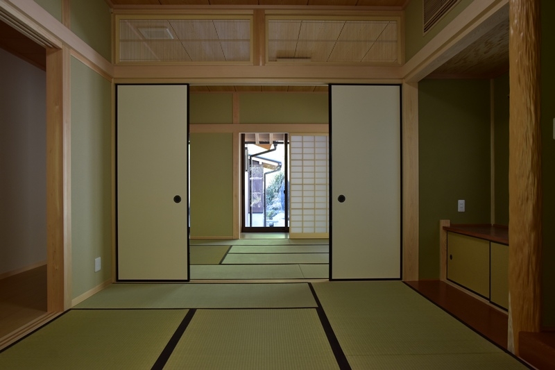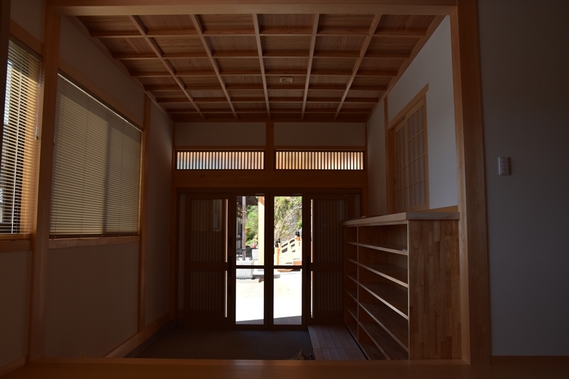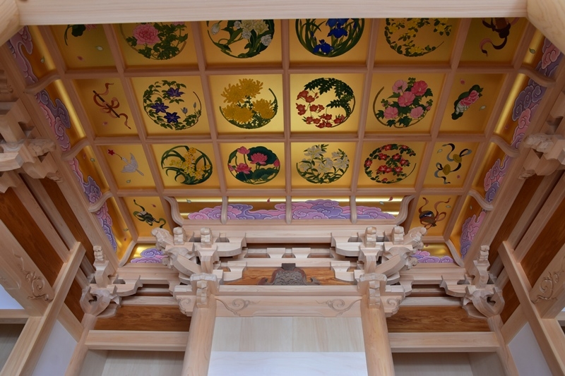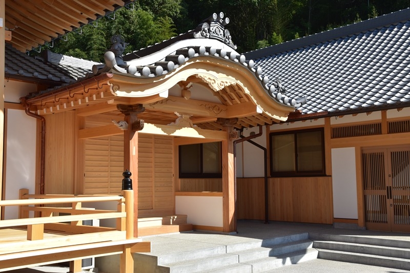 | 仕様 | ≪本堂≫ 間口6.0間×奥行6.5間(身舎) 物入8坪,花立場2坪,後堂,廊下11坪(下屋) 柱頭装置:出組 側柱:1.0尺丸(檜)内部柱:1.26尺丸(欅),1.0尺丸(檜), 向拝柱:9.0角(檜) 天井:内陣,折上格天井,余間,外陣,柵内 格天井 ≪庫裡≫ 唐破風玄関 間口9.0尺×奥行6.0尺 柱6.0角(欅)柱頭装置:大斗肘木(欅材は旧山門材再利用) 渡り廊下,便所棟 切妻造 12.5坪 ≪離れ≫ 通し柱,管柱:4.0寸角(檜) 切妻造:三州製桟瓦葺 ≪納骨堂≫ 船枻造,宝形屋根:三州製桟瓦葺(露盤・宝珠瓦製) 側柱:7.0寸角大面取り(檜) ≪外部便所≫ ガルバリウム鋼板横葺 |