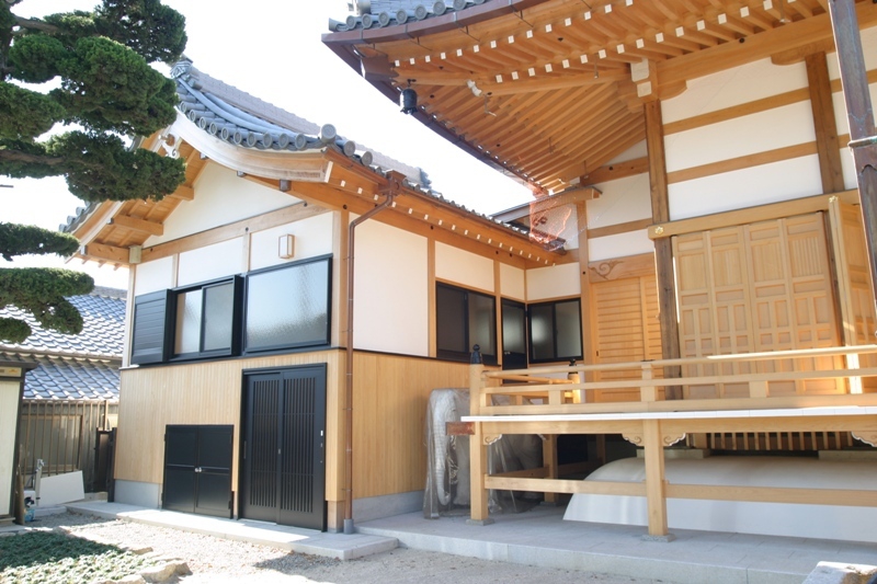 | 仕様 | ≪本堂修理≫ 木造,入母屋造,流れ向拝付,本瓦葺,二軒繁垂木 ・柱頭装置:舟肘木に変更 ・柱不陸・傾き修正 耐震補強 ・丸桁より上部及び向拝取替え ・柱,天井洗い ・付属廊下,納骨堂,便所改修 |