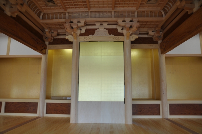| 仕様 | ≪本堂≫ 木造,入母屋造,流れ向拝付,桟瓦葺 3方廊下付 二軒疎垂木:1枝1尺間 柱頭装置:出組 三州製日本瓦 桟瓦葺53判(空葺) 側柱:1.16尺丸(欅) 1.0尺丸 8.6寸丸(桧) 内部柱:1.26尺丸(欅) 9.8寸丸(桧) 向拝柱:9.0寸角(桧) 天井:内陣―折上小組格天井 約3.0尺角(亀の尾) 外陣・余間―格天井 約2.5尺角 地下:納骨堂 |