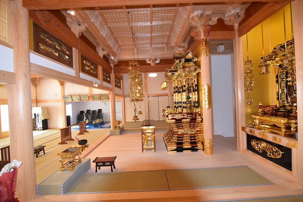 | 仕様 | ≪本堂≫ 木造,入母屋流れ向拝付,三州製桟瓦葺 柱頭装置:大仏様式(檜) 側柱:8.0寸角(檜),1.0尺角(檜) 内部柱:1.0尺丸~8.0寸丸(檜)、6.0寸角(檜) 向拝柱:9.0寸角(檜) 天井:内陣 折上小組格天井(2.8尺角) 外陣 格天井(2.3尺角) 余間 小組格天井(2.0尺角) 下屋・渡り廊下:金属板葺き |
