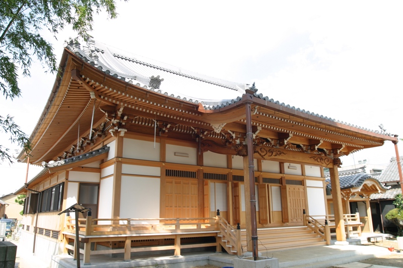 | 仕様 | ≪本堂≫ 木造,入母屋造,流れ向拝付,一体型本瓦葺 二軒繁垂木:1枝5.0寸 柱頭装置:出組 側柱:9.0寸角(欅) 8.0寸角 6.0寸角(桧) 内部柱:1.2尺丸 9.0寸丸(欅) 9.0寸丸(桧) 向拝柱:1.0尺角(欅) 天井:内陣―折上小組格天井 外陣・柵内・余間―格天井 ≪玄関棟≫ 木造,平家建,切妻造,唐破風玄関付,桟瓦葺,22坪 |