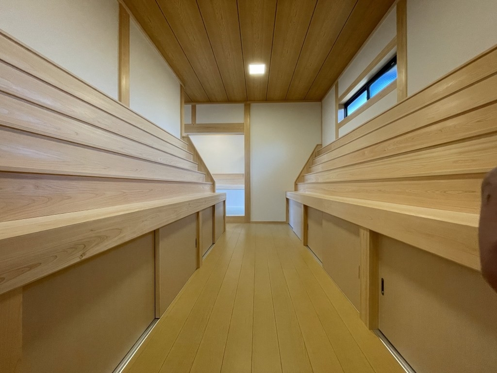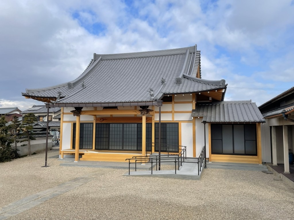 | 仕様 | ≪本堂≫ 木造,入母屋造,流れ向拝付,桟瓦葺、疎垂木(1枝15.0寸) 側柱:桧6.0寸角,桧5.0寸角 内部柱:桧8.0寸角, 8.0丸、5.0寸角 向拝柱:桧6.0角 内陣天井: 格天井、木目調クロス 大間天井: 格天井、木目調クロス 室中、脇間、広縁天井: 目透かし風クロス 壁 : 漆喰風クロス ≪位牌堂・開山堂≫ 柱:桧5.0寸角 天井:目透かし風クロス 壁:漆喰風クロス |