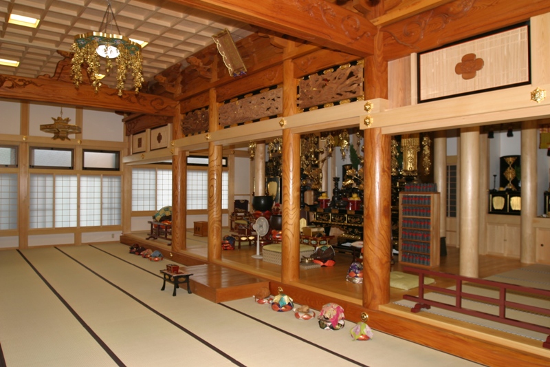 | 仕様 | ≪本堂≫ 木造,入母屋造,本瓦葺,二軒半繁垂木 柱頭装置:平三ッ斗組 側柱:9.0寸角 8.0寸角(欅) 8.0寸角 7.0寸角 6.0寸角(桧) 内部柱:1.0尺丸 9.0寸丸(欅) 9.0寸丸(桧) 天井:外陣・脇ノ間―格天井 内陣―小組格天井 |