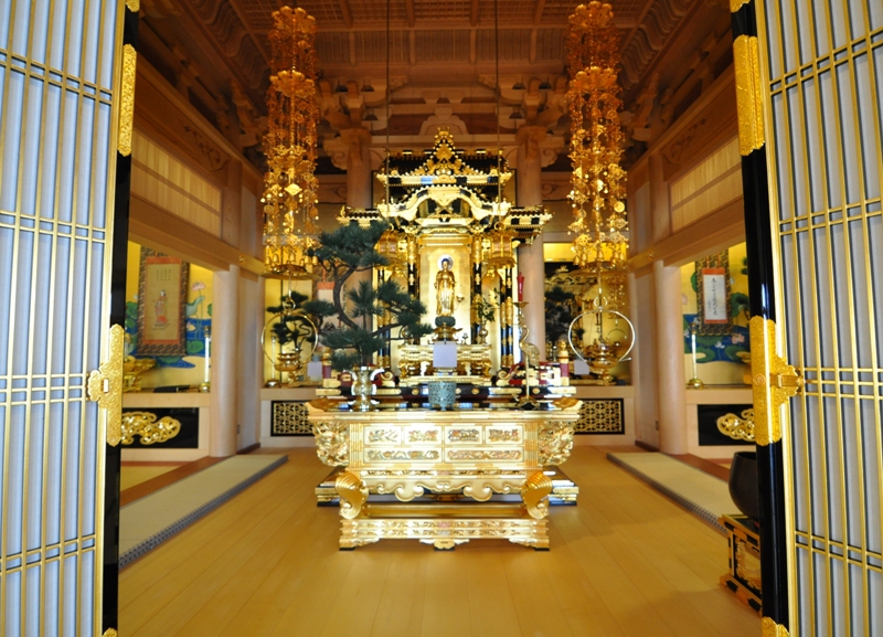| 仕様 | ≪本堂≫ 木造,入母屋造,流れ向拝付,一体型本瓦葺 二軒繁垂木:1枝5.0寸 柱頭装置:出組 側柱:1.2尺丸(欅) 1.1尺丸 1.0尺丸 6.0寸角 5.0寸角(桧) 内部柱:1.3尺丸 1.1寸丸 1.0尺丸(欅) 1.1尺丸(桧) 向拝柱:1.0尺角 天井:外陣・柵内・余間―格天井 内陣―折上小組格天井 |